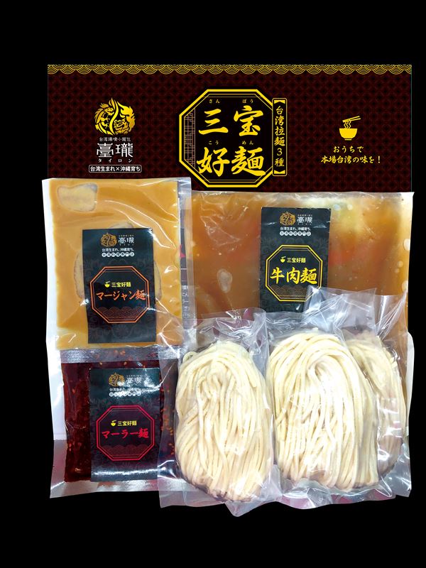 台湾を代表する麺類[牛肉麵]、[麻醤(マージャン)麺]、[麻辣(マーラー)麺]を1パックに詰め込んだ贅沢な王道麺セット。